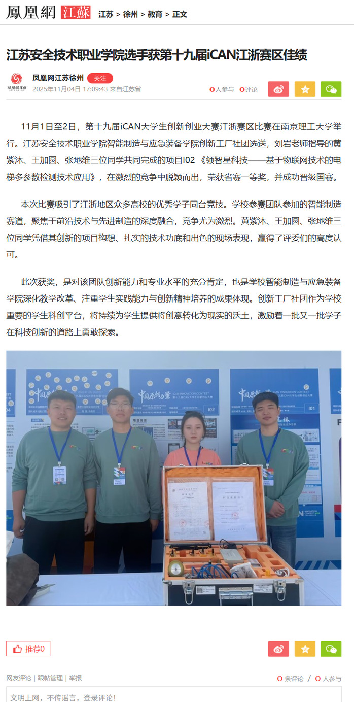 凤凰网江苏:江苏安全技术职业学院选手获第十九届iCAN江浙赛区佳绩