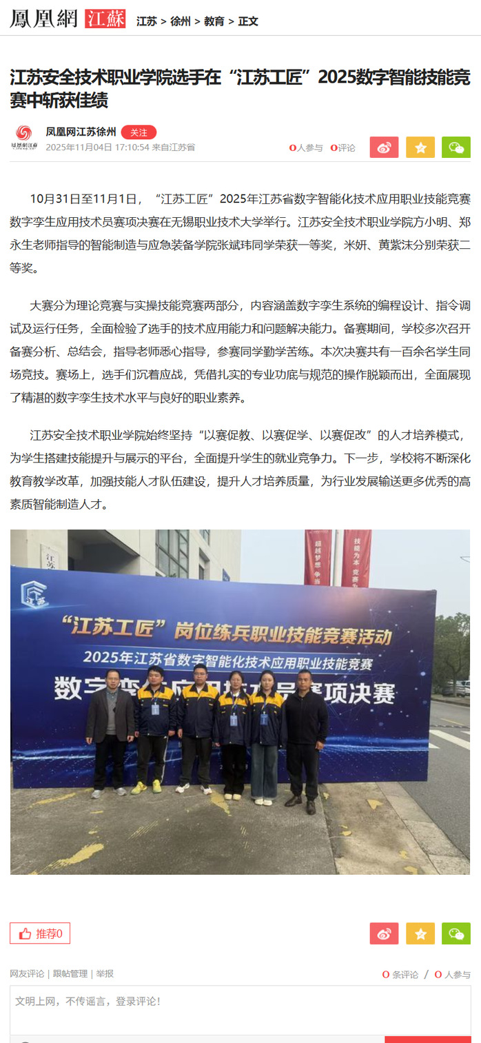 凤凰网江苏:江苏安全技术职业学院选手在“江苏工匠”2025数字智能技能竞赛中斩获佳绩