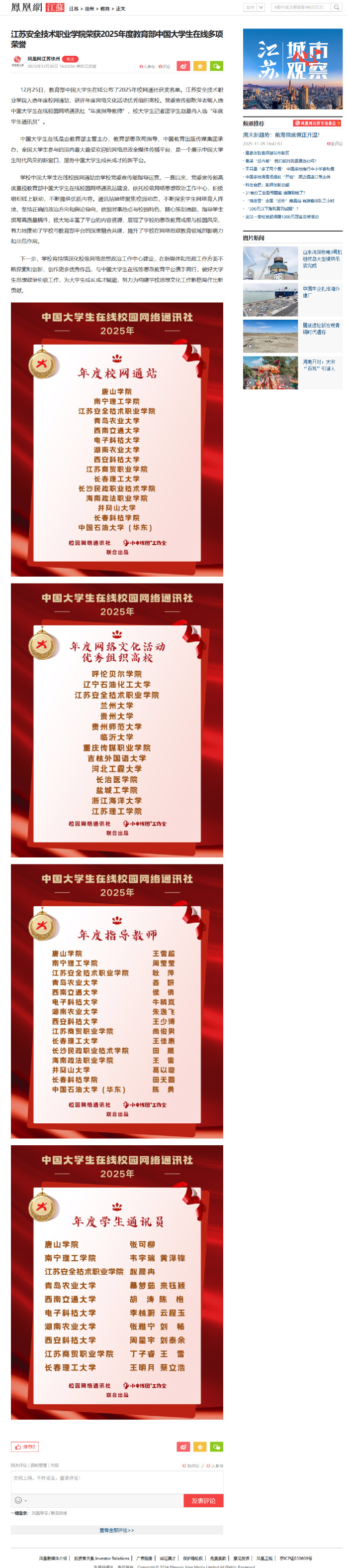 凤凰网江苏:江苏安全技术职业学院荣获2025年度教育部中国大学生在线多项荣誉